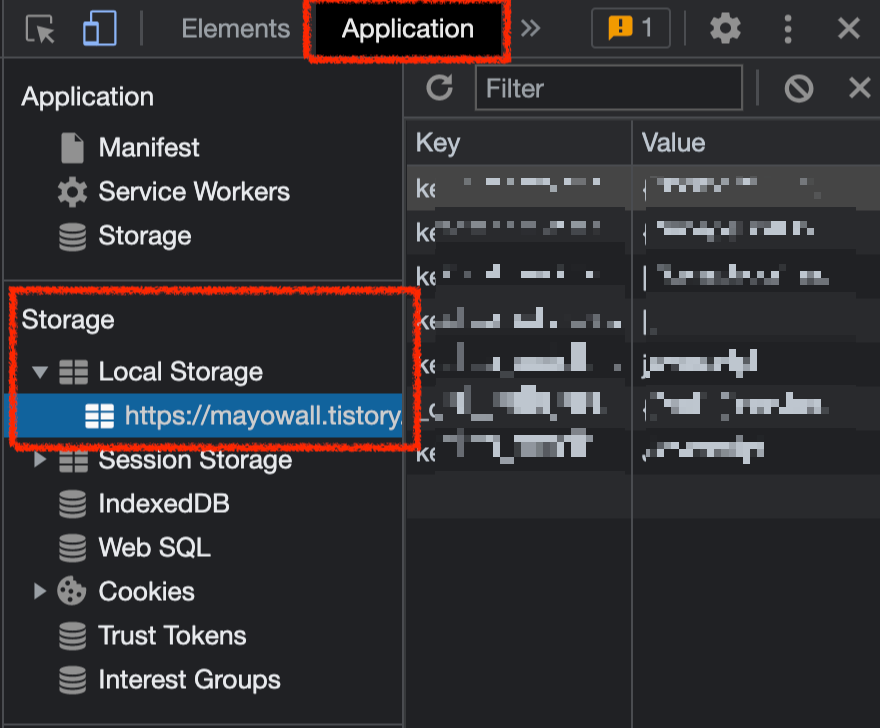 브라우저에 저장된 LocalStorage 데이터는 개발자 도구 > Application > LocalStorage을 통해 확인할 수 있습니다.